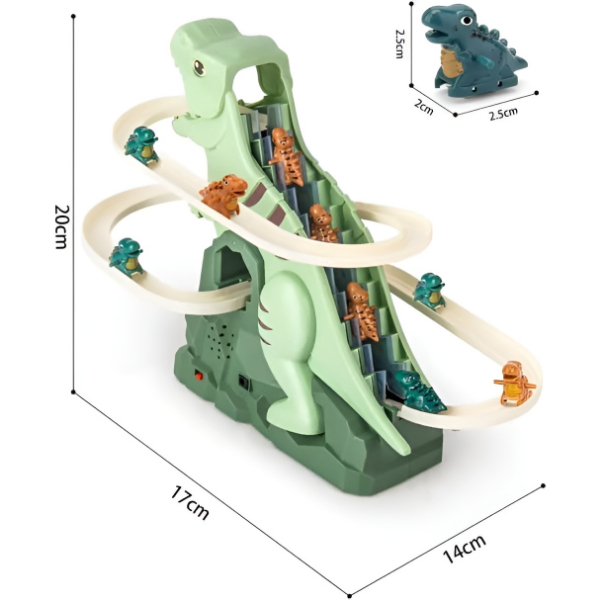 DINOCLIMBER nabízí dinosauří horskou dráhu s hudbou a zářivými světly, která vytváří poutavé dobrodružství, když dinosauři šplhají po schodech za doprovodu rytmu a efektů.
